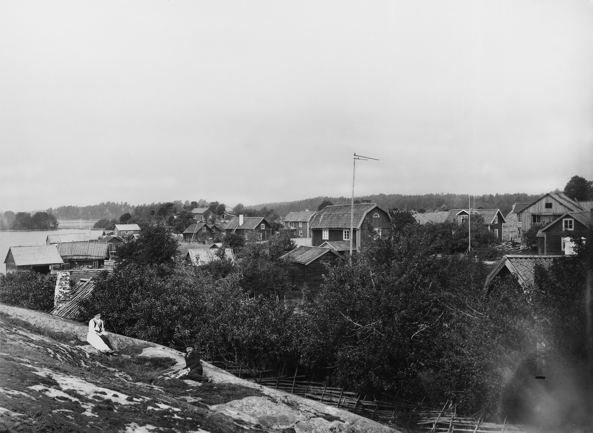 Uppland. Värmdö Skeppslag. Värmdö socken. Gällnö. En kvinna och en man sittande på klippan. Foto av prosten P.L. Quist 1894.