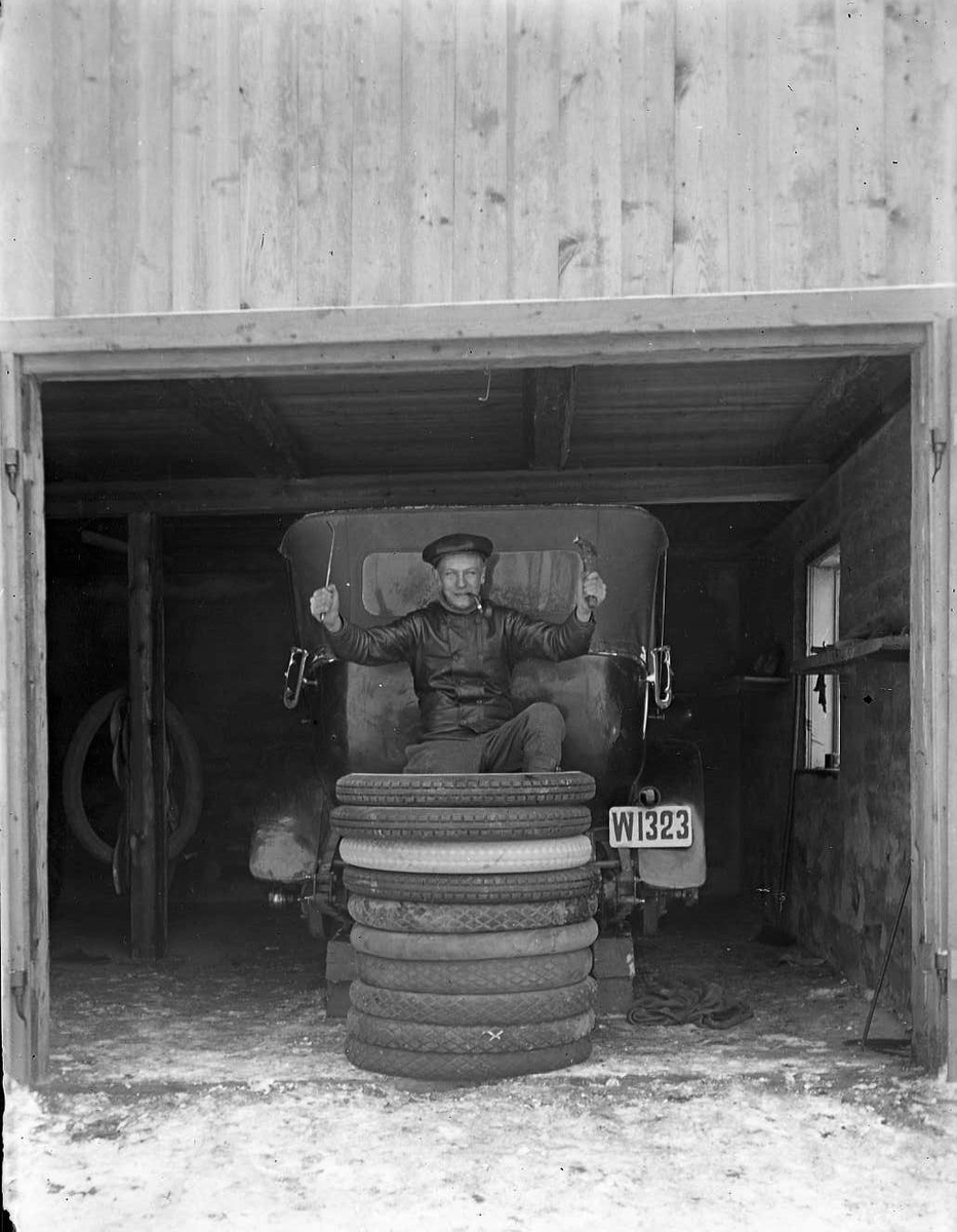 En bilmekaniker ovanpå en hög av bildäck i ett garage.