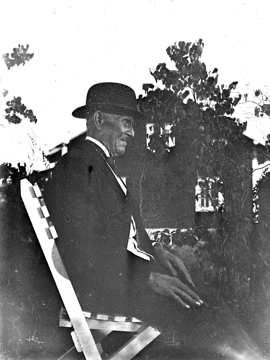 En gammal man sitter i trädgården.