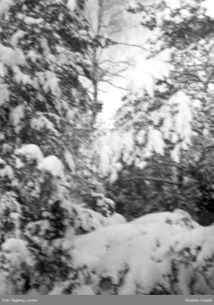 Vinterbild. Snötyngda grenar.