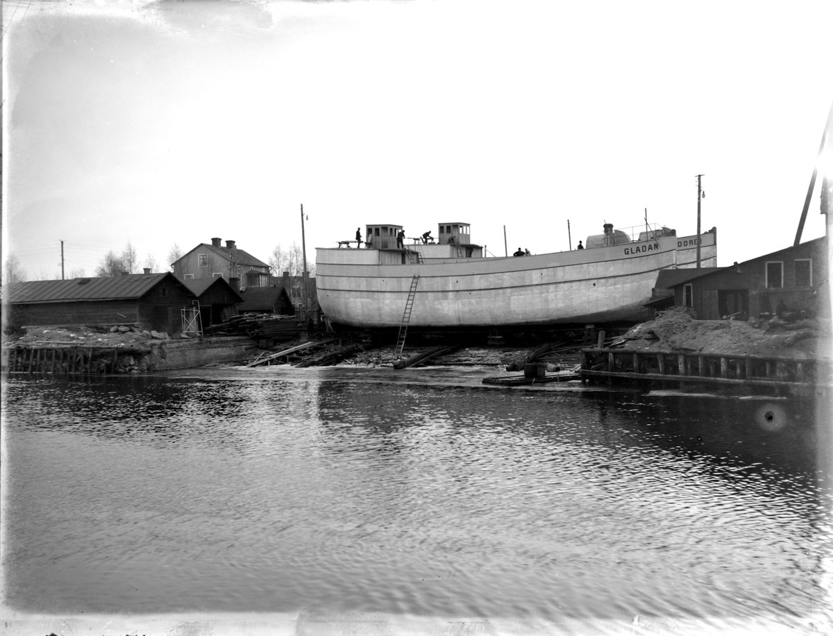 Två motorpråmar: Condoren och Gladan, på slipern. 6 arbetare på båtarna.
