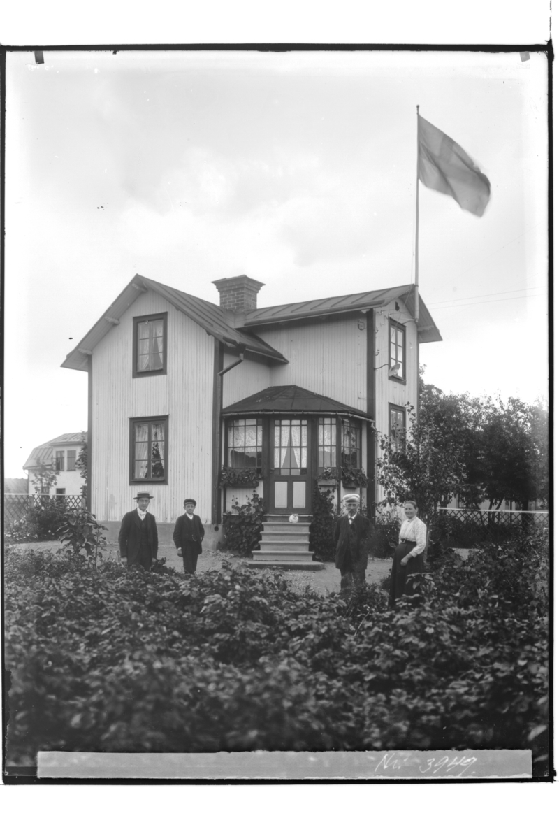 En och en halvplans bostadshus med glasad veranda , 4 personer framför huset.