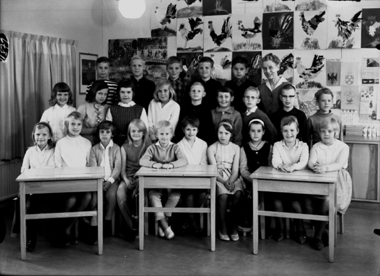 Lillåstrandskolan, klassrumsinteriör, 20 skolbarn med lärarinna fru Maja Mollbeck.