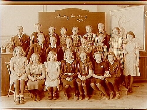 Almby skola, klassrumsinteriör, 20 skolbarn med lärare K.G. Karlsson, klass 6, sal 2.