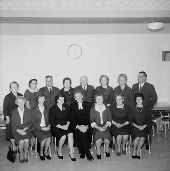 Titel: Interiör, konfirmationsgrupp, elva kvinnor, tre män och en präst.