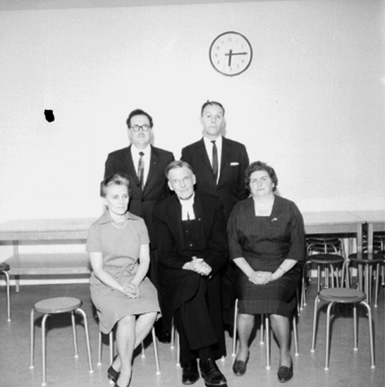 Interiör, konfirmationsgrupp, två kvinnor, två män och en präst.
