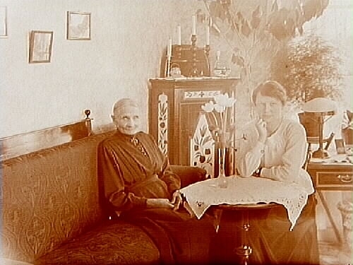 Rumsinteriör, två kvinnor vid bordet.