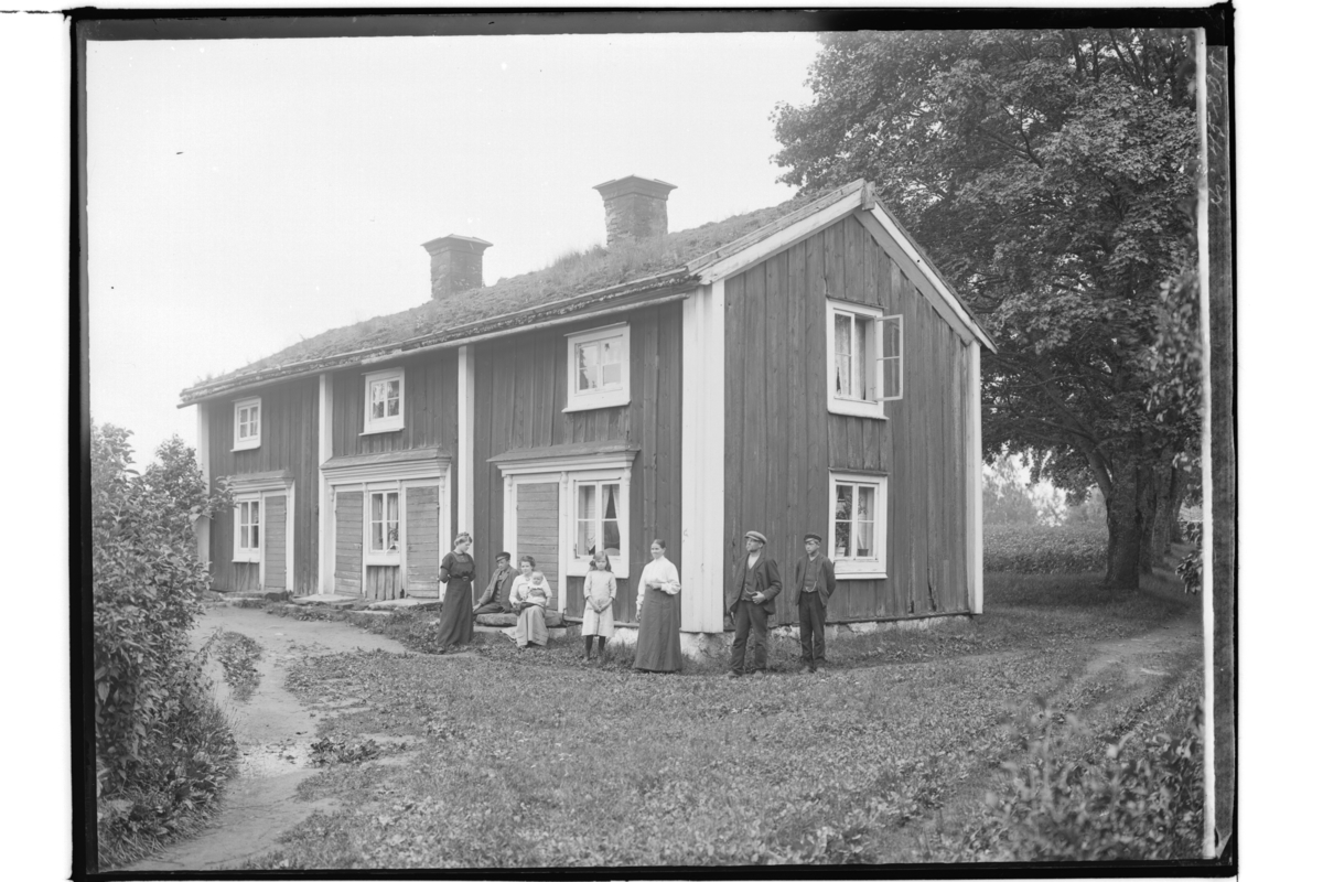 Siggebohyttan, tvåvånings bostadshus, 8 personer vid husknuten.