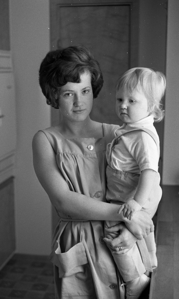 Titel: Frövi industrinedläggning 25 mars 1966 Kvinna med barn i köket
