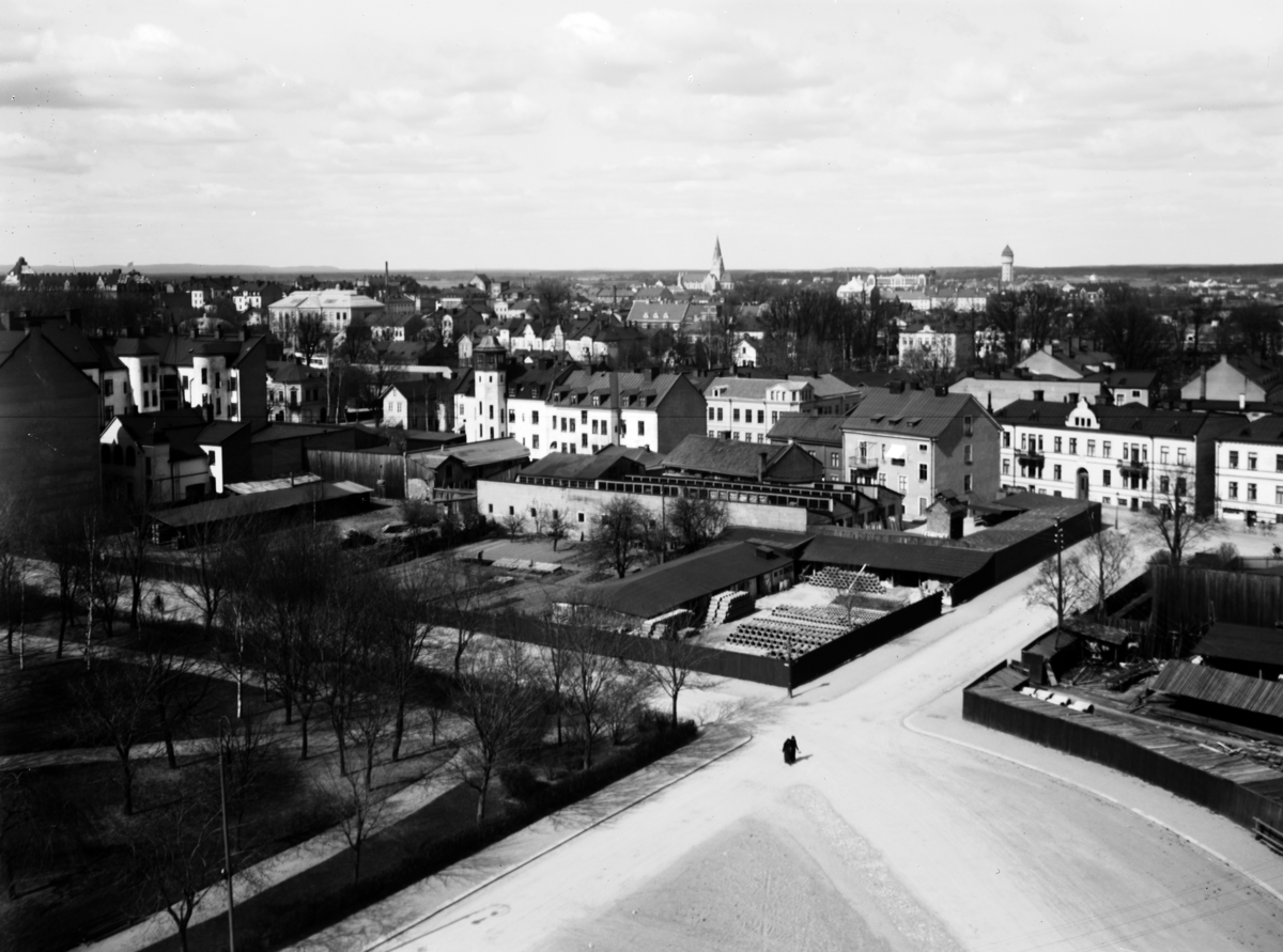 Utsikt mot nordväst från Oskarsplan, Engelbrektsskolans klocktorn.