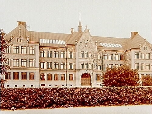 Västra Folkskolan, trevånings skolbyggnad i rött tegel.