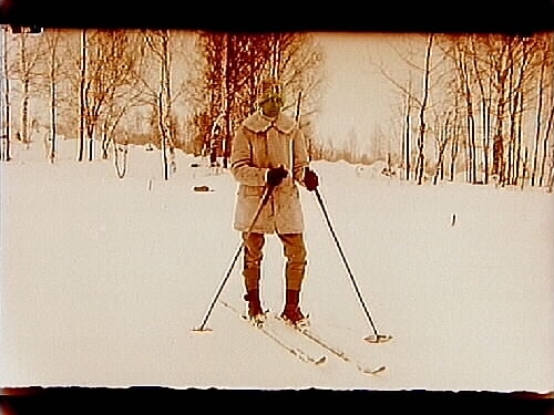 En soldat med vinterutrustning på skidor. 1 kompaniet.