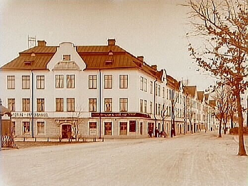 Trähus i tre våningar med fasad i gulvit slätputs och sten.