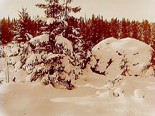 Vintermotiv, snöhöljda flyttblock och träd.