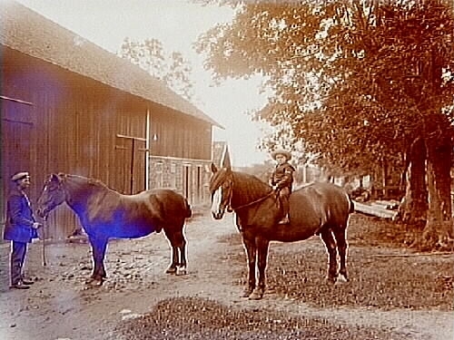Titel: En man med två hästar, den ena hästen med en liten pojke på ryggen. Aug. Vädel