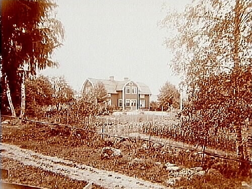 En och en halvvånings bostadshus med frontespis och brutet tak.