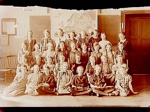 Titel: Norra skolan, klassrumsinteriör, 30 skolflickor med lärare, klass 6A, sal 21. Lärare fröken Elin Hellman