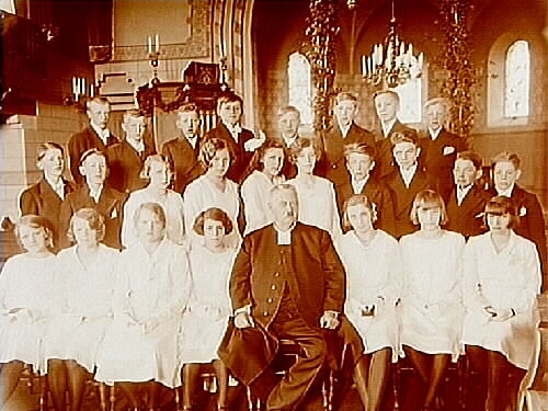 Konfirmander, 11 flickor, 14 pojkar och kyrkoherde Valdén.