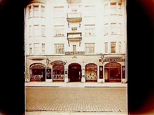 Stenhus i fem våningar, affärslokaler i gatuplanet.