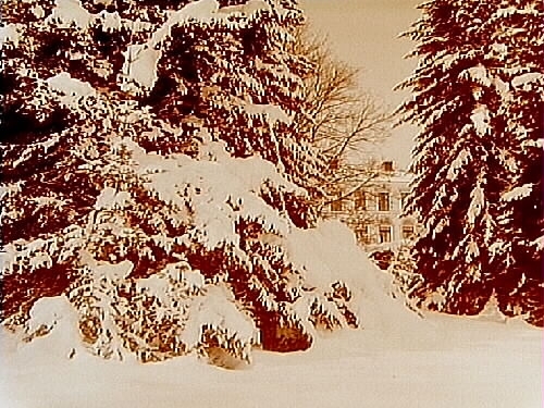 Karlslunds Herrgård, tvåvånings herrgårdsbyggnad i snö.