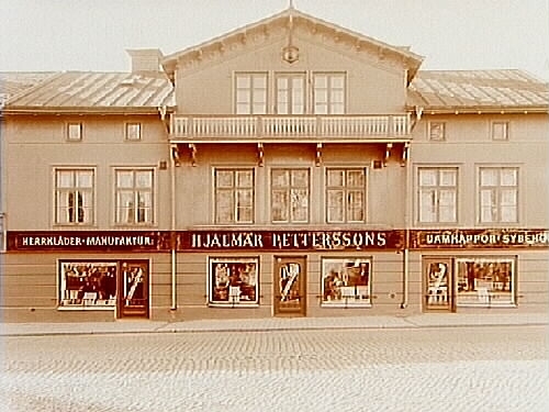 Tvåvånings bostadshus med affärslokaler i gatuplanet, Hjalmar Petterssons Klädeshandel, Herrkläder, Manufaktur, Damkappor, Sybehör.