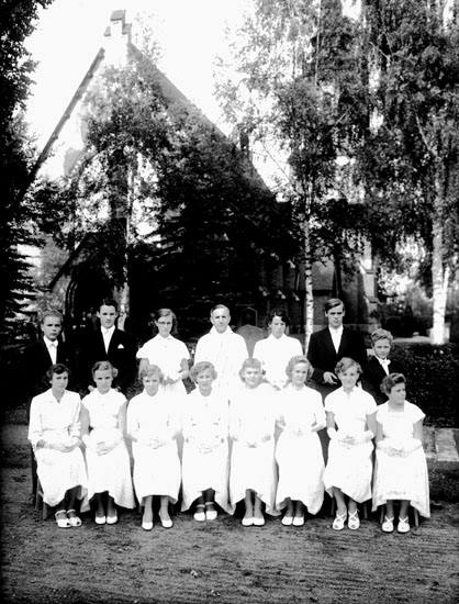Privata konfirmander, tio flickor, fyra pojkar och krykoherde Berndt Bäcklund.