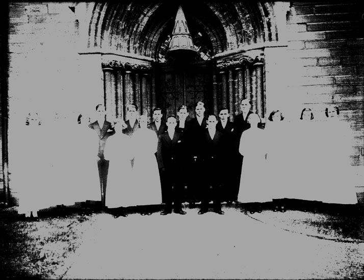 Konfirmander, 9 flickor, 8 pojkar och dövstumspastor Areskog.