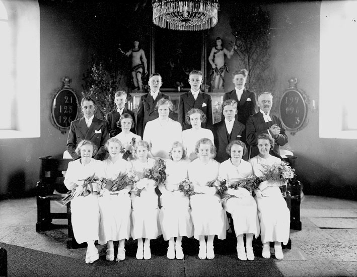 Konfirmander, 10 flickor, 6 pojkar och en präst.