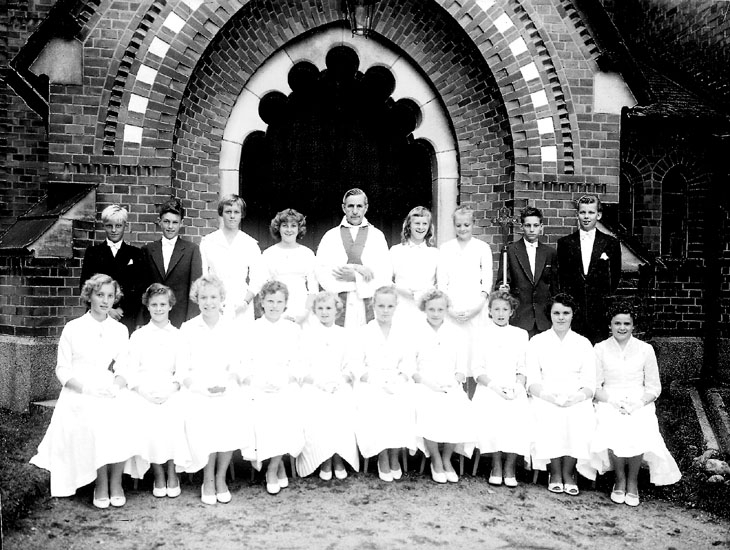 Konfirmander, 14 flickor, 4 pojkar och kyrkoherde Berndt Bäcklund.