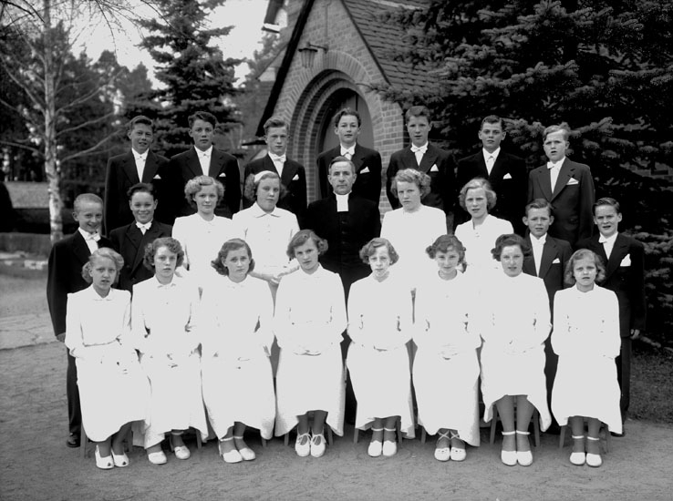 23 konfirmander, 12 flickor, 11 pojkar och kyrkoherde Berndt Bäcklund.