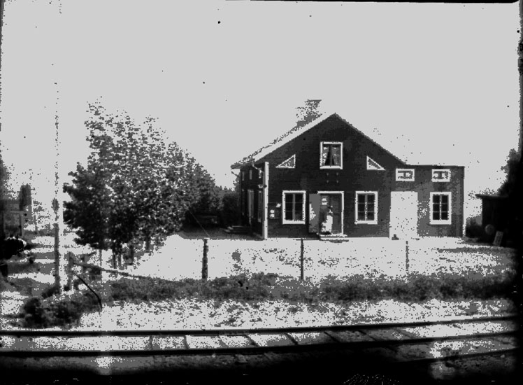 Bostadshus med trädgård. Järnvägsspår vid sidan av staketet.