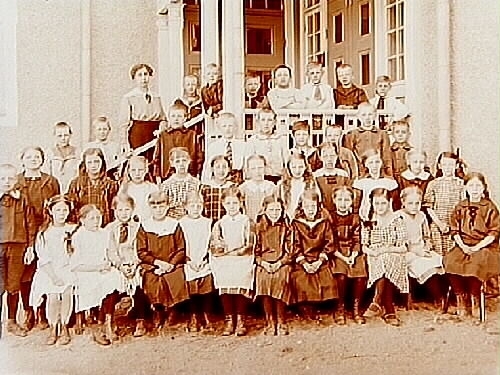 40 skolbarn och lärarinnan Eva Holmelin, på skoltrappan.