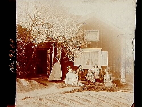 Bostadshus, sju personer framför huset.
