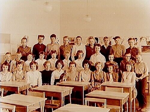 Klassrumsinteriör, elever med lärarinna fröken Birgit Dahlström, klass 6Bg, sal 5 AÖ.