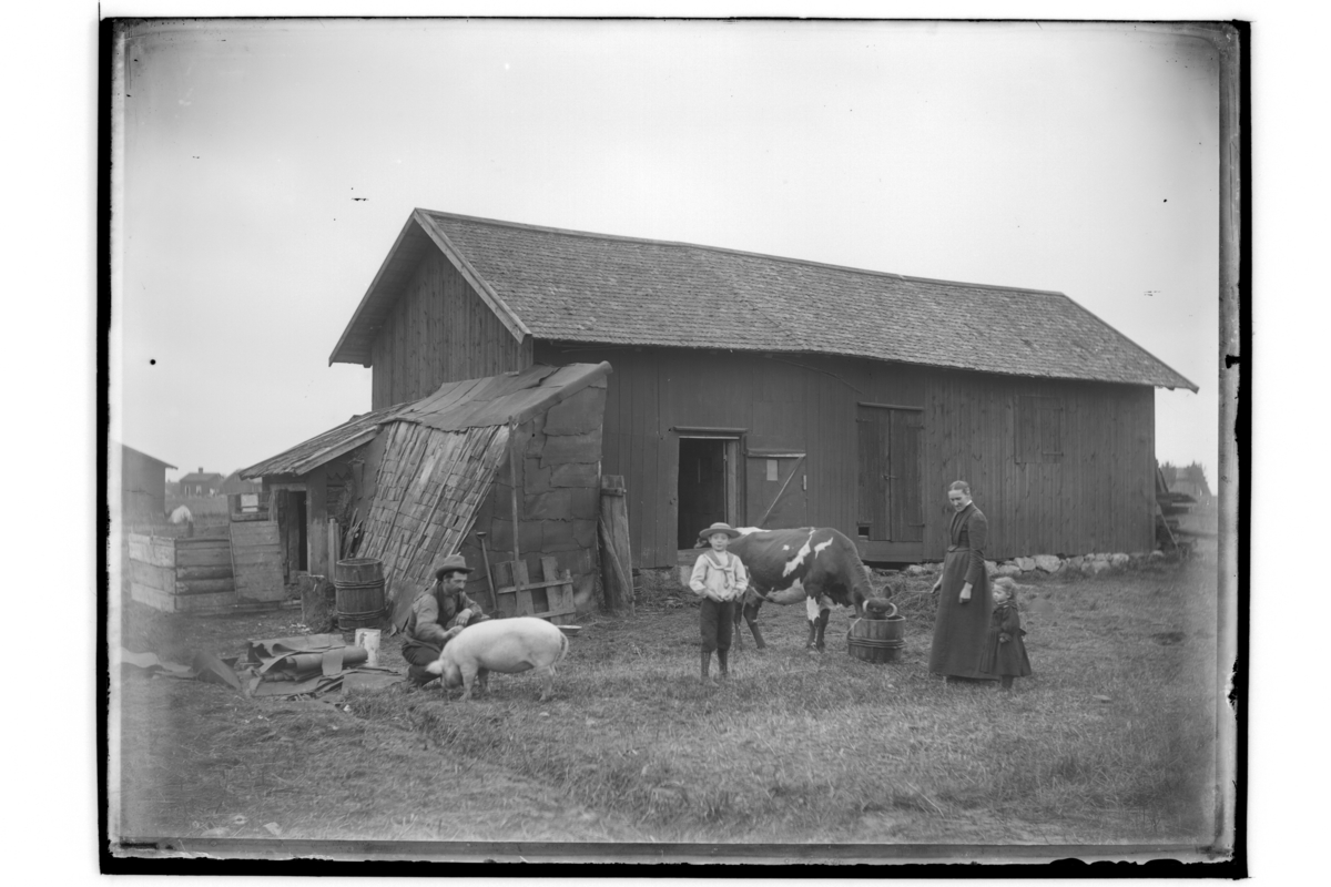 Ekonomibyggnad, 4 personer, en gris och en ko.