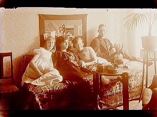 Rumsinteriör, familjegrupp 4 personer i soffan.
