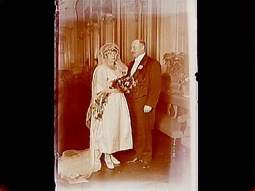 Bruden helt i vitt, med lång slöja, brudgummen i frack.