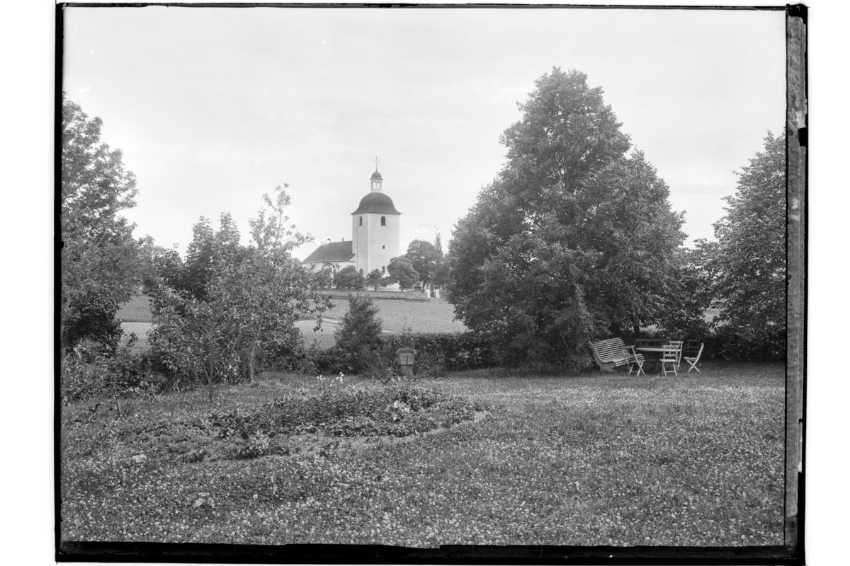 Stora Mellösa kyrka från fröknarna Årmans trädgård.