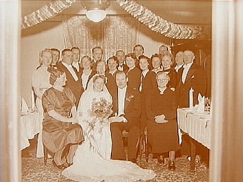 Bröllop, brudpar och bröllopsgäster inomhus.