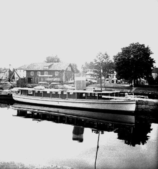 Båten ligger i Svartån framför Kanotföreningens hus, nedströms slussen.