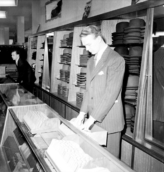 Jörnstedt, affärsinteriör, strumpdisken, två män.