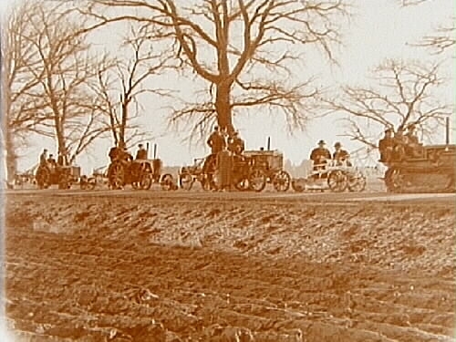 16 personer, gruppbild, 4 traktorer.