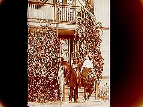 En och en halvvånings bostadshus, vinkelbyggt, med balkong och veranda, familj 5 personer på verandatrappan.