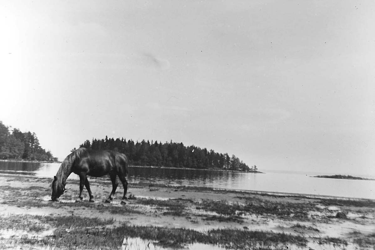 Sjön Unden från nordligaste viken. En häst i förgrunden.