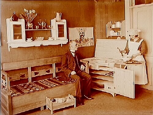 Köksinteriör, en man sitter i soffan och en kvinna bakar.