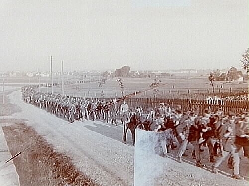 6 komp. Marscherande soldater och befäl på Almbyvägen, Almby socken.