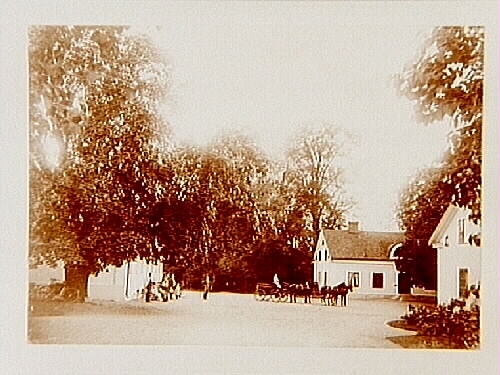 Vagn med fyrspann (fyra hästar), två bostadshus, 5 personer.