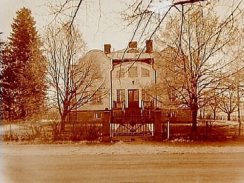 Tvåvånings bostadshus med tre frontespis, trapphus, balkonger och burspråk, brutet tak med takhuvar.