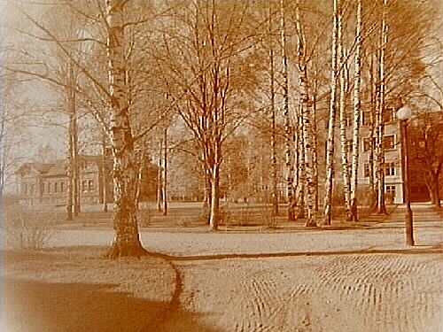 Trevånings lasarettsbyggnader, envånings läkarvilla, trevånings vinkelbyggt bostadshus.