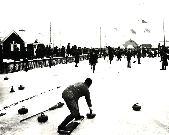 Curlingtävling vid Eyravallen år 1924, curlingstugan till vänster